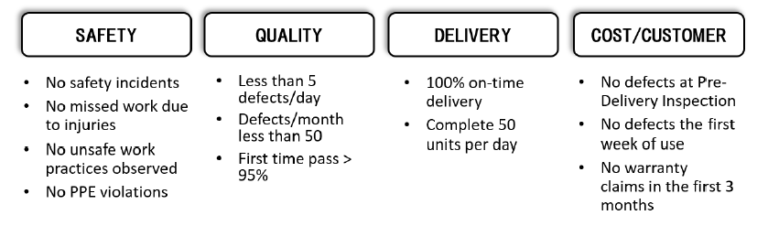 Lean organizations eliminate this barrier by making quality ownership visible at the work area. When operators are expected to identify and respond to issues immediately, quality becomes a habitual response rather than just a reaction. Figure 145 – KPI Examples reinforces this behaviour by displaying quality metrics alongside safety, delivery, and cost, sending a clear message that quality matters every day, not just during audits.